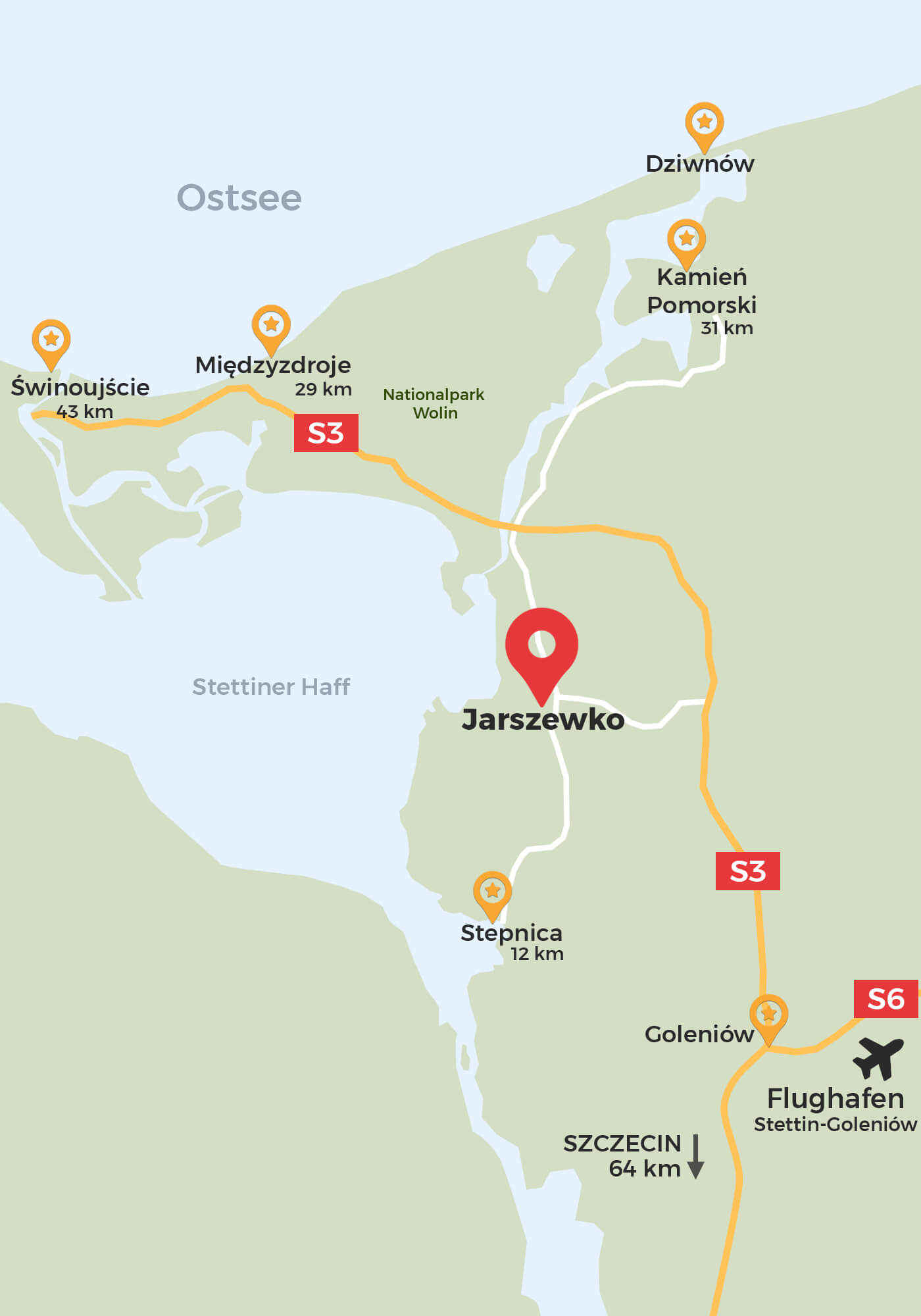 Das Gelände liegt in der Nähe wichtiger Verkehrswege – der Straße 111, der S3 und der E65. Die S3 bietet eine bequeme Anbindung nach Süden in Richtung Stettin, Flughafen Stettin-Goleniów und der Autobahn A 6, und führt nach Norden bis Swinemünde.